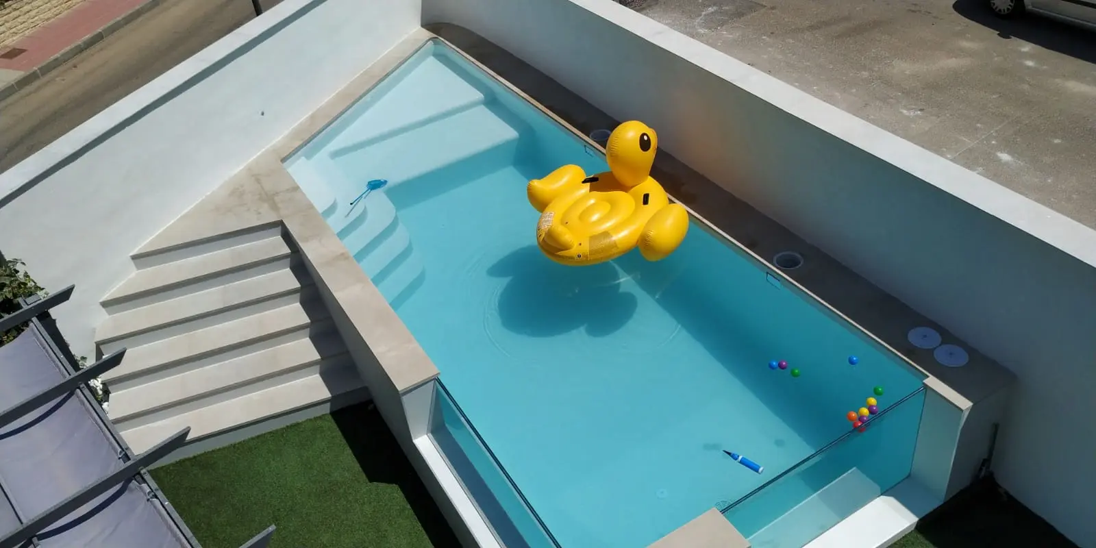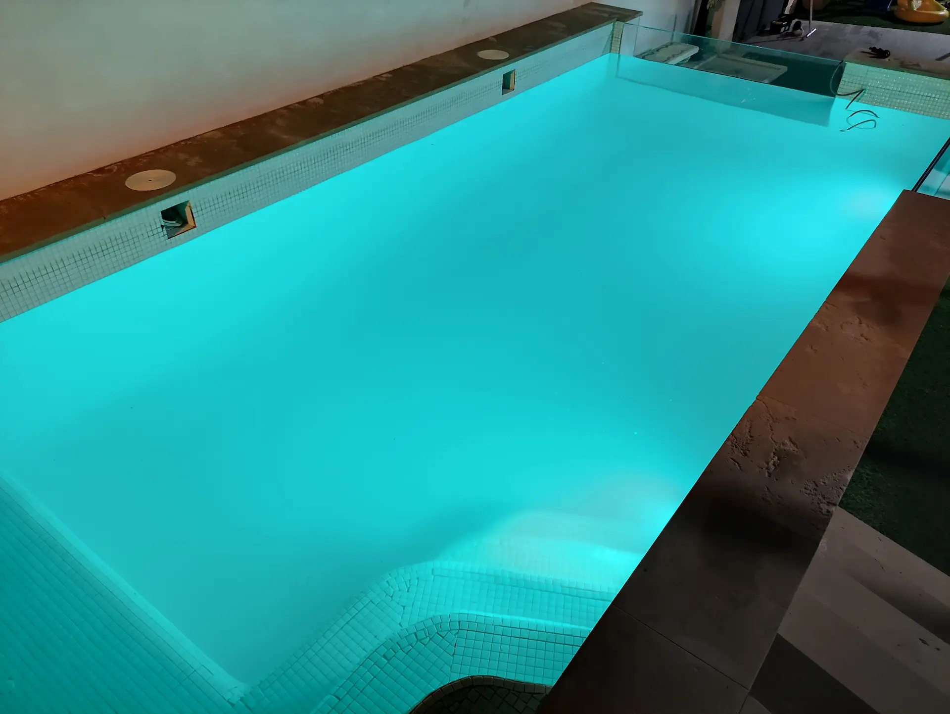Como elemento diferenciador, la instalación incorpora dos ventanas de vidrio templado, que no solo potencian la estética del conjunto, sino que también generan un efecto visual único, convirtiendo la piscina en un punto focal del espacio.