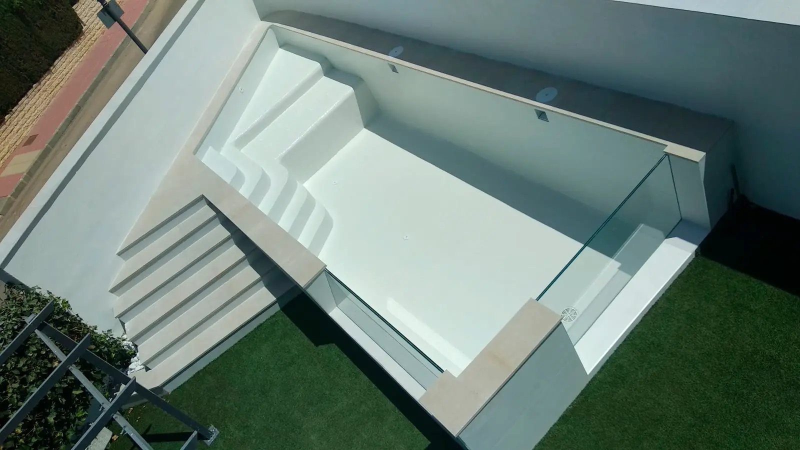 La piscina cuenta con escalera de obra tanto en el interior como en el exterior, lo que facilita el acceso al vaso desde cualquier punto. El revestimiento elegido fue gresite blanco modelo Sulu de Hisbalit, que aporta luminosidad, durabilidad y un acabado elegante.
