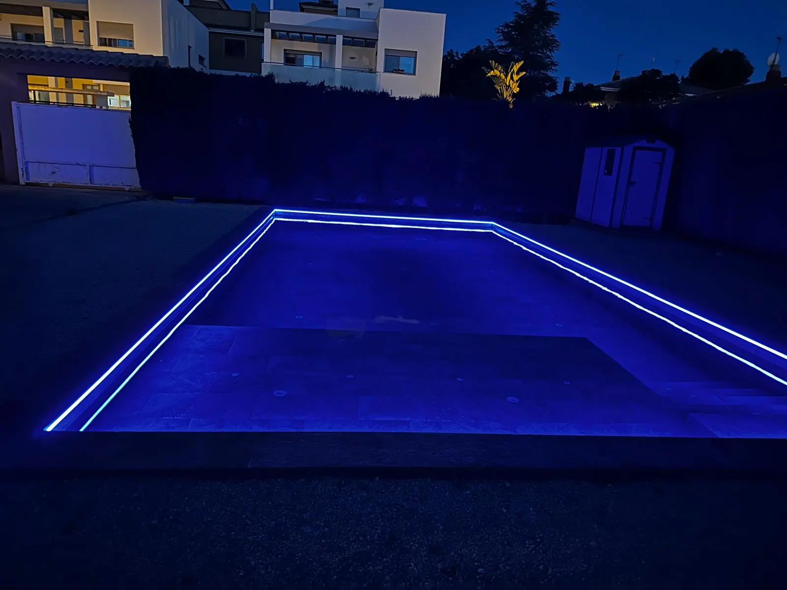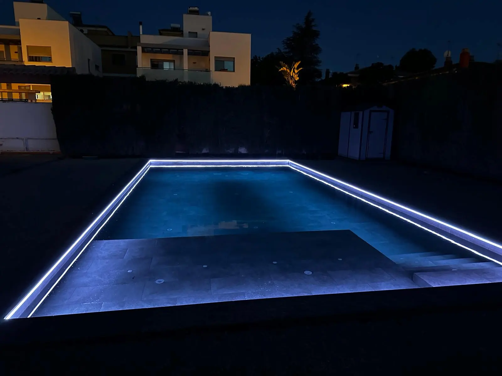 Como elemento diferenciador, se incorporó una tira LED integrada, que proporciona una iluminación ambiental única y resalta las líneas de la piscina durante la noche, creando un efecto visual elegante y moderno.